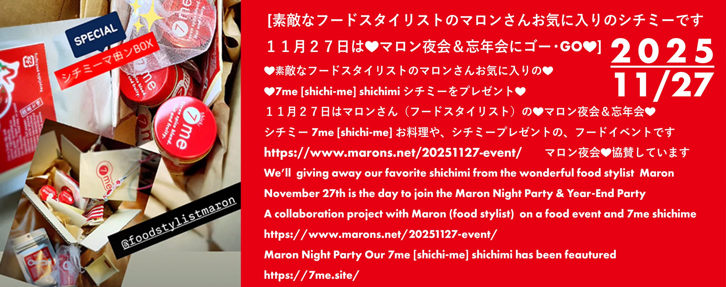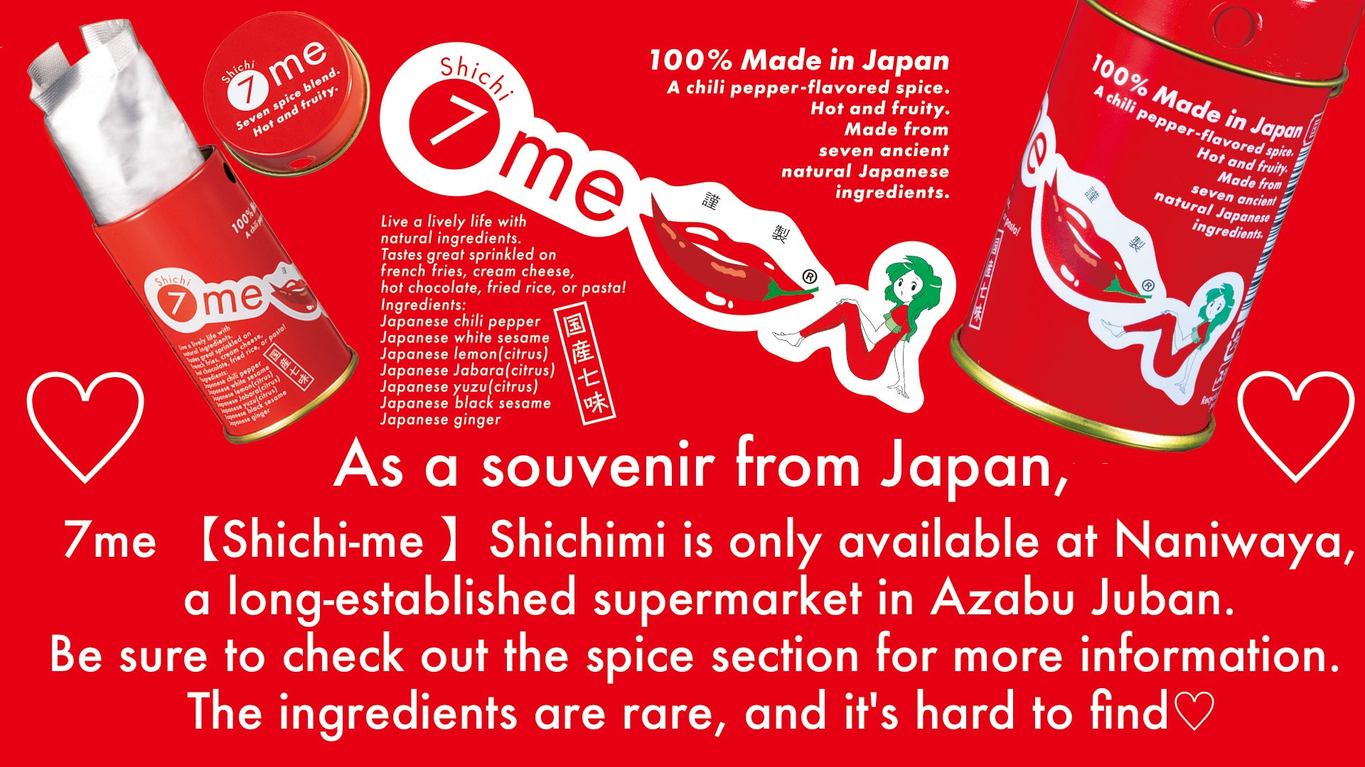 7me [shichi-me] Shichimi is a fruity "new sensation shichimi pepper" made from 100% domestic ingredients and containing lemon, jabara, yuzu, ginger, chili pepper, white sesame seeds, and black sesame seeds.